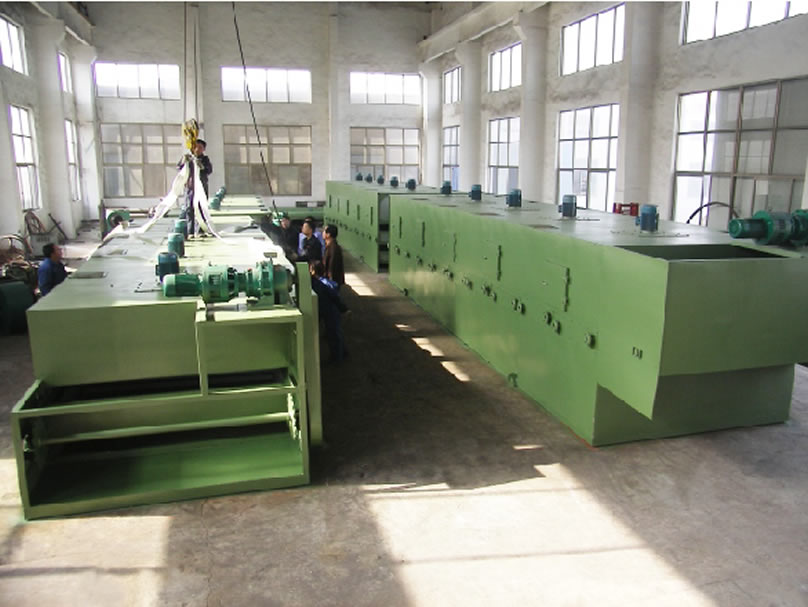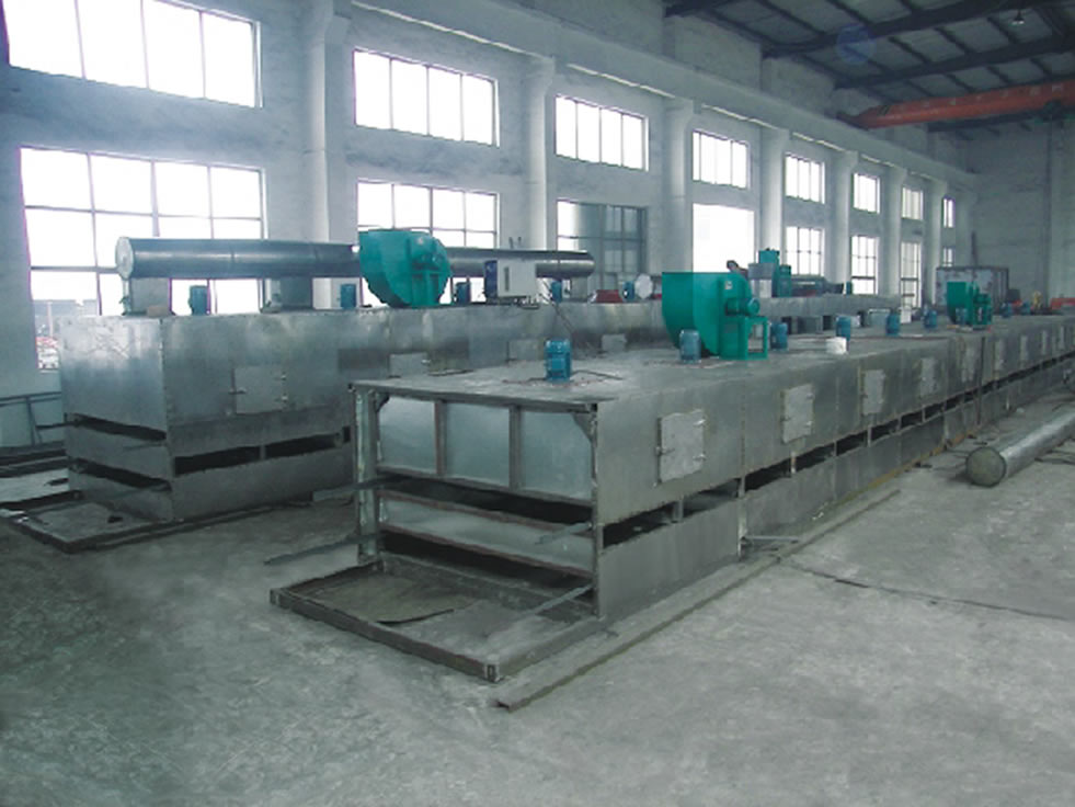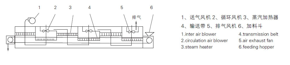 物料由加料器均勻地舖在網帶上,網帶一般採用12-60目不銹鋼絲網,由傳動裝置拖動在乾燥機內移動。乾燥機由若干單元組成,每一單元熱風獨立循環,部分尾氣由專門排濕風機排出,廢氣由調節閥控制,熱氣由下往上或由上往下穿過鋪滿物料的網帶完成熱量與質量傳遞的進程,帶走物料水份。網帶緩慢移動,運行速度可根據物料溫度自由調節,乾燥後的成品連續落入收料器中。上下循環單元根據用戶需要可靈活配備,單元數量亦可根據需要選取。