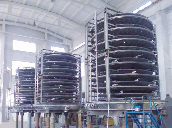 濕物料自加料器連續地加到干燥器上部第一層乾燥盤上,帶有耙葉的耙臂作迴轉運動使耙臂作迴轉運動使耙葉連續地翻抄物料。物料沿指數螺旋線流過乾燥盤表面,在小乾燥盤上的物料被移送到外緣,並在外緣落到下方的大干燥盤外緣,在大干盤上物料向裡移動並從中間落料口落如下一層小乾燥盤中。大小乾燥盤上下交替排列,物料得以連續地流過整個乾燥器。中空的干燥盤內通入加熱介質,加熱介質形式有飽和蒸汽、熱水和導熱油,加熱介質由乾燥盤的一端進入,從另一端導出。已乾物料從最後一層乾燥盤落到殼體的底層,最後被耙葉移送到出料口排出。濕份從物料中逸出,由設在頂蓋上的排濕口排出,真空型盤式乾燥器的濕氣由設在頂蓋上的真空泵口排出。從底層排出的干物料可直接包裝。通過配加翅片加熱器、溶劑回收冷凝器、袋式除塵器、乾料返混機構、引風機等輔機,可提高其乾燥的生產能力,乾燥膏糊狀和熱敏性物料,可方便地回收溶劑,並能進行熱解和反應操作。