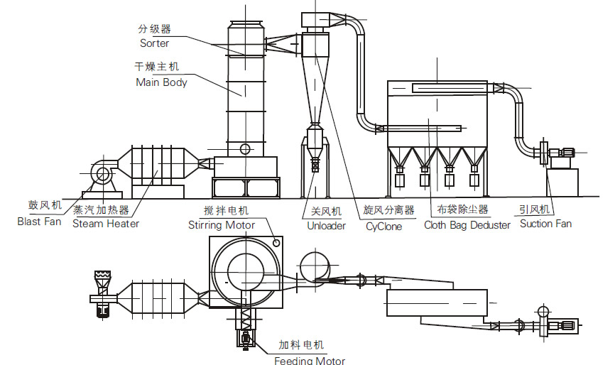●乾燥室內周向氣速高,物料停留時間短,有效防止物料粘壁及熱敏性物料變質現象,達到高效、快速、小設備、大生產。